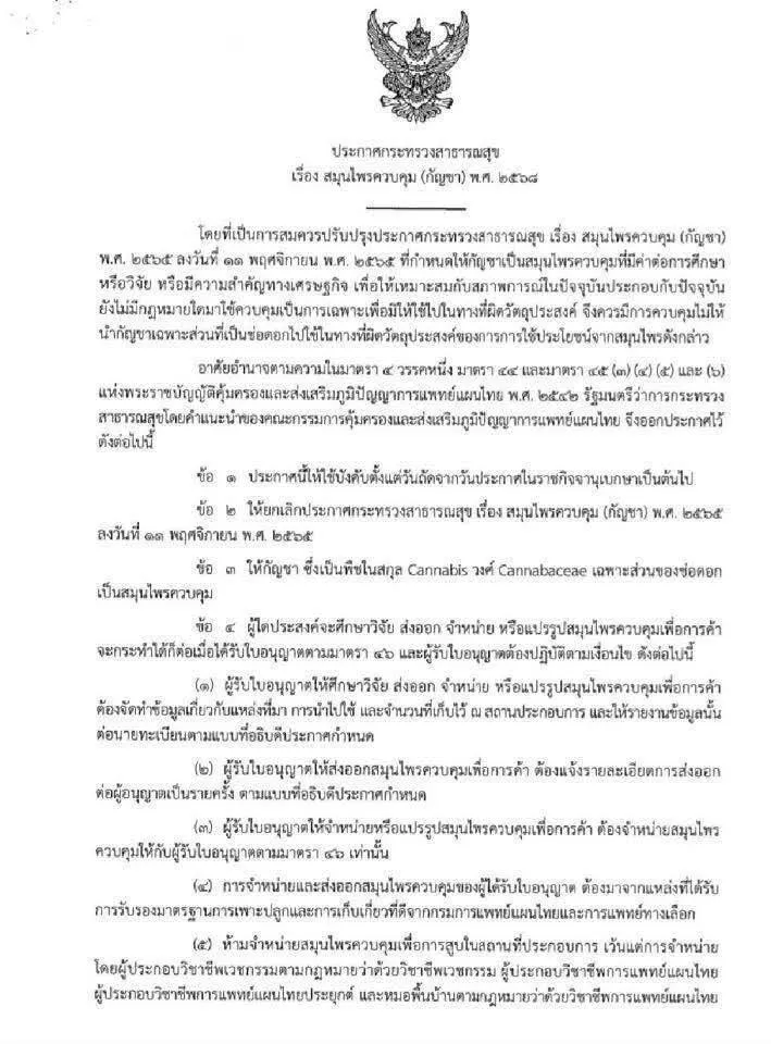 เมื่อวันที่ 23 มิถุนายน 2568 ที่ผ่านมา สำนักงานปลัดกระทรวงสาธารณสุข โดยรัฐมนตรีว่าการกระทรวงสาธารณสุข ได้ออกประกาศกระทรวงสาธารณสุข เรื่อง สมุนไพรควบคุม (กัญชา) พ.ศ. 2568 ซึ่งมีผลบังคับใช้ทันที นับเป็นความเคลื่อนไหวสำคัญที่รัฐบาลได้มีนโยบาย ยกเลิกการใช้กัญชาเพื่อสันทนาการ และ ควบคุมการใช้กัญชาให้จำกัดอยู่เฉพาะเพื่อประโยชน์ทางการแพทย์เท่านั้น เพื่อป้องกันผลกระทบต่อประชาชน โดยเฉพาะอย่างยิ่งกลุ่มเยาวชน