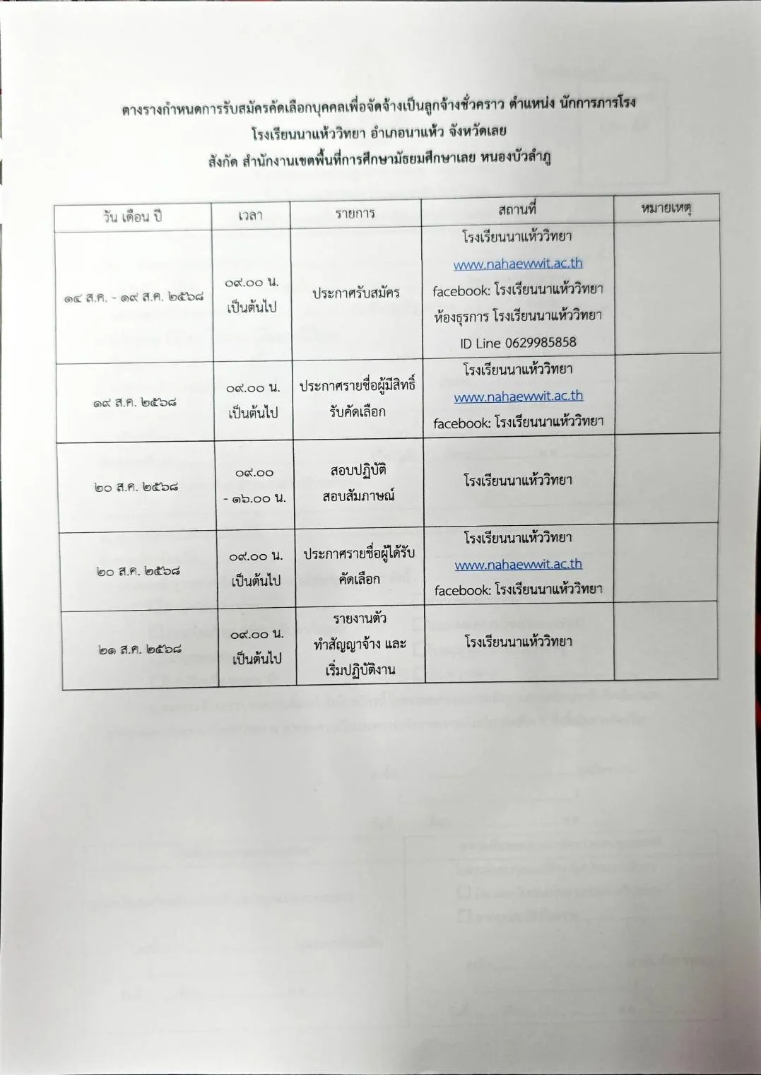 ประกาศรายชื่อผู้มีสิทธิ์เข้ารับการคัดเลือก: ภายในวันที่ 22 สิงหาคม 2568 ณ โรงเรียนนาแห้ววิทยา หรือทางเว็บไซต์ www.nahaewwit.ac.th และ Facebook ของโรงเรียน.