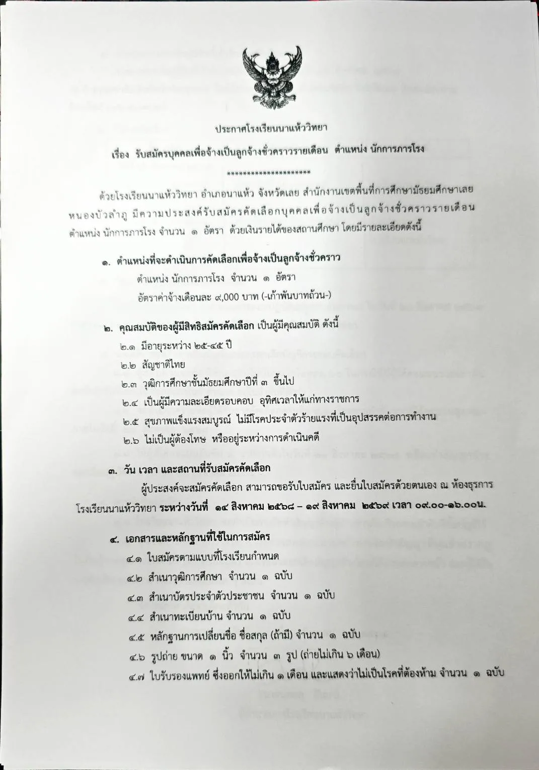 ด้วยโรงเรียนนาแห้ววิทยา อำเภอนาแห้ว จังหวัดเลย มีความประสงค์จะรับสมัครสอบคัดเลือกบุคคลเพื่อจัดจ้างเป็นลูกจ้างชั่วคราวรายเดือน ในตำแหน่ง นักการภารโรง จำนวน 1 อัตรา โดยผู้ที่ได้รับการคัดเลือกจะได้รับอัตราค่าจ้างเดือนละ 9,000 บาท.