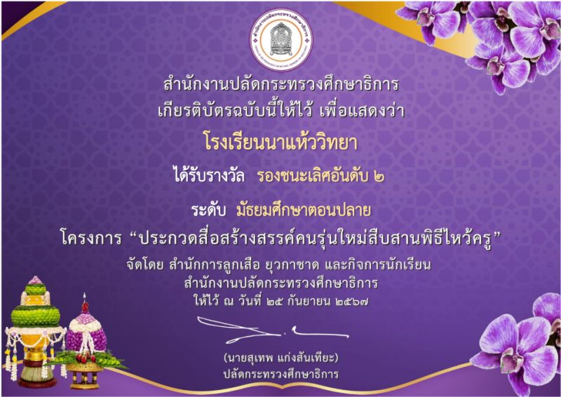 โรงเรียนนาแห้ววิทยา ได้รับรางวัล รองชนะเลิศอันดับ ๒ ระดับ มัธยมศึกษาตอนปลาย โครงการ "ประกวดสื่อสร้างสรรค์คนรุ่นใหม่สืบสานพิธีไหว้ครู" จัดโดย สำนักงานปลัดกระทรวงศึกษาธิการ