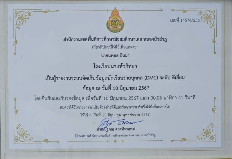 โรงเรียนนาแห้ววิทยาได้รับยกย่องเป็นตัวอย่างที่ดีในการรายงานระบบจัดเก็บข้อมูลนักเรียนรายบุคคล (DMC) ประจำปีการศึกษา 2567