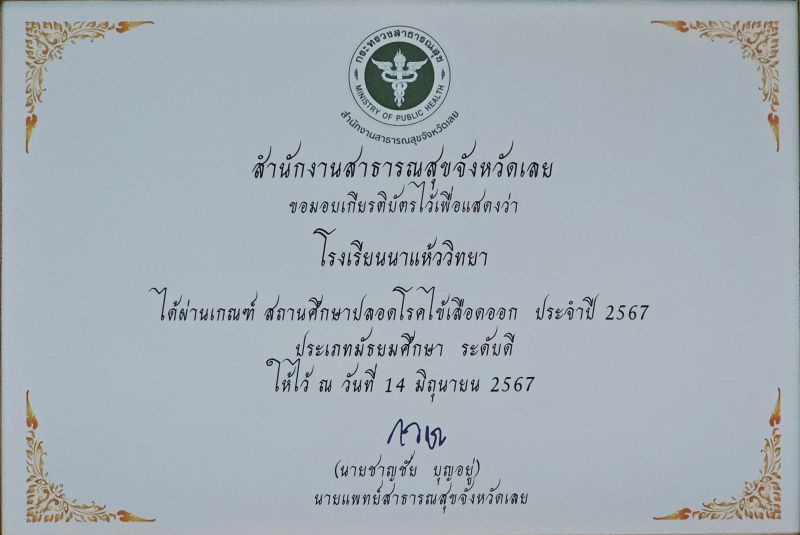 โรงเรียนนาแห้ววิทยา ได้รับรางวัลสถานศึกษาปลอดไข้เลือดออก ประจำปี 2567 ประเภทมัธยมศึกษา ระดับดี จากสำนักงานสาธารณสุขจังหวัดเลย