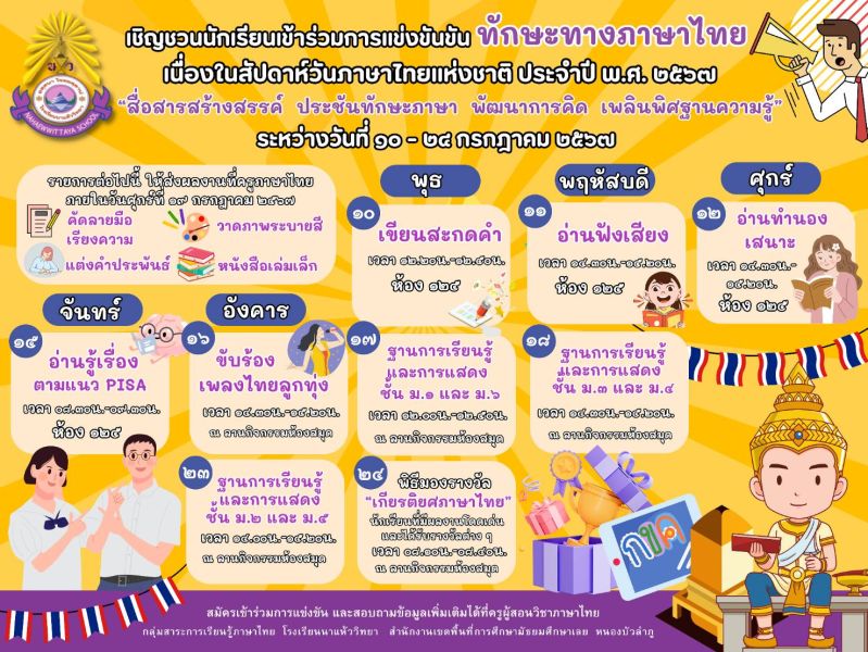 เชิญชวนนักเรียนเข้าร่วมการแข่งข้นข้น ทักษะทางภาษาไทย เนื่องในสัปดาห์วันภาษาไทยแห่งชาติ ประจำปี พ.ศ. ๒๕๖๗ สื่อสารสร้างสรรค์ ประชันทักษะภาษา พัฒนาการคิด เพลินพิศฐานความรู้