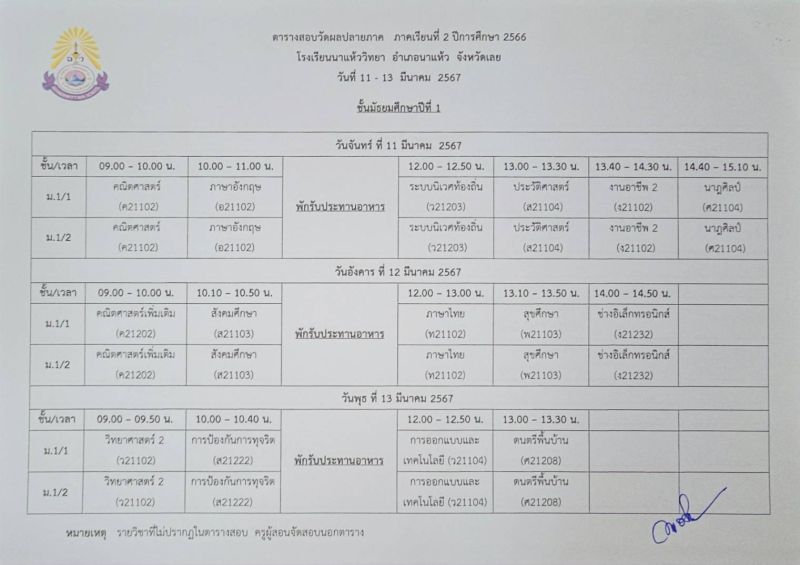 ปฏิทินสอบวัดผลปลายภาค ภาคเรียนที่ 2 ปีการศึกษา 2566 ระหว่างวันที่ 11 - 13 เดือนมีนาคม พ.ศ. 2567