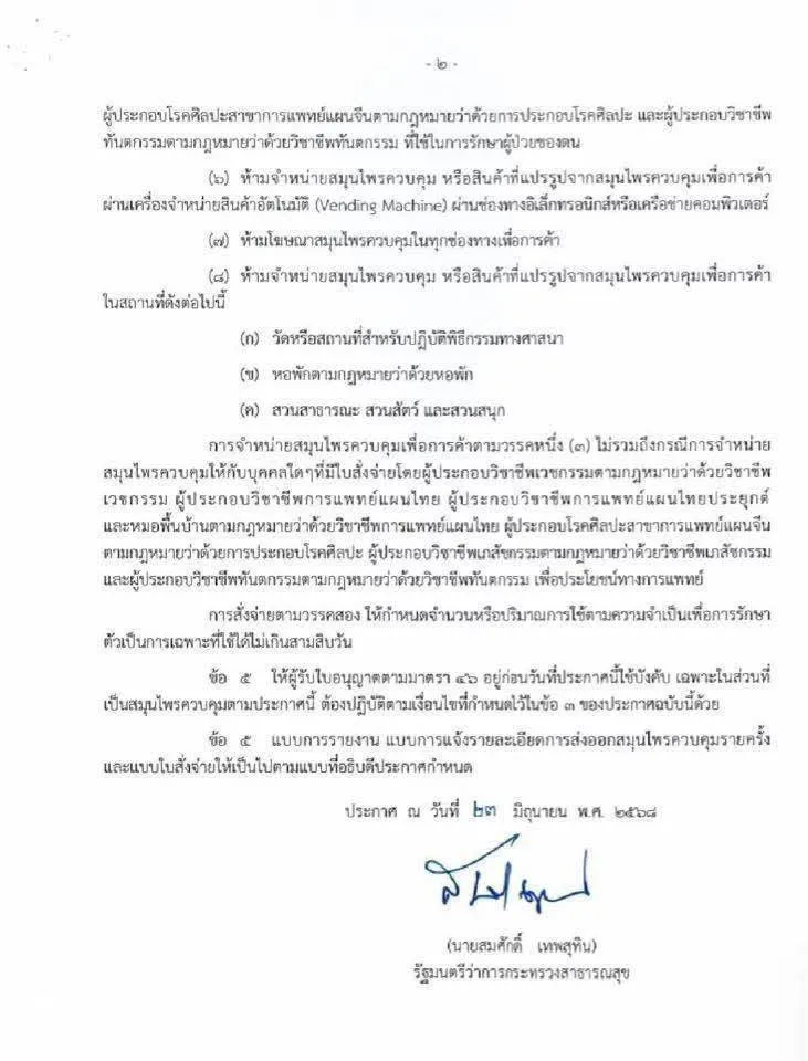 - สถานที่ห้ามจำหน่าย/ใช้: ห้ามจำหน่ายสมุนไพรควบคุมเพื่อการค้าตามวรรคหนึ่ง (เว้นแต่กรณีจำหน่ายให้แก่บุคคลใดที่ใบสั่งจ่ายโดยผู้ประกอบวิชาชีพเวชกรรมตามกฎหมาย) ณ สถานศึกษา หอพักตามกฎหมายว่าด้วยหอพัก สวนสาธารณะ สวนสัตว์ และหอสมุดสาธารณะ