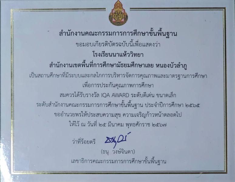 โรงเรียนนาแห้ววิทยาได้รับรางวัล IQA AWARD ระดับ ดีเด่น ประเภทสถานศึกษาขนาดกลาง ระดับสำนักงานคณะกรรมการการศึกษาขั้นพื้นฐาน
