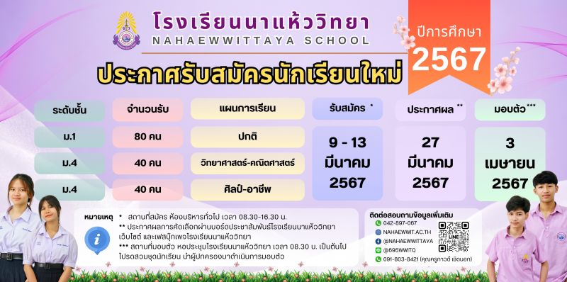 โรงเรียนนาแห้ววิทยา เปิดรับสมัครนักเรียน ประจำปีการศึกษา 2567