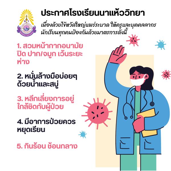 ประกาศโรงเรียนนาแห้ววิทยา เนื่องด้วยไข้หวัดใหญ่แพร่ระบาด ให้ครูและบุคคลลากร นักเรียนทุกคนป้องกันด้วยมาตรการ