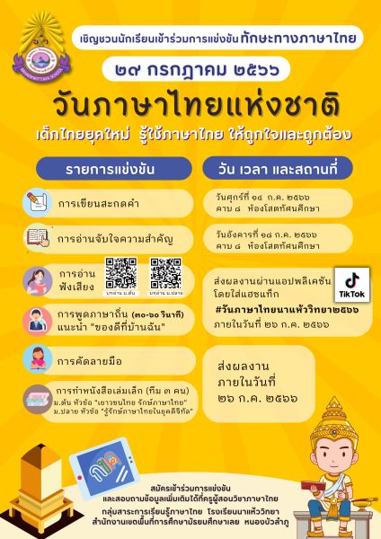 ขอเชิญชวนนักเรียนเข้าร่วมการแข่งขันทักษะทางภาษาไทย 29 กรกฎาคม 2566 วันภาษาไทยแห่งชาติ