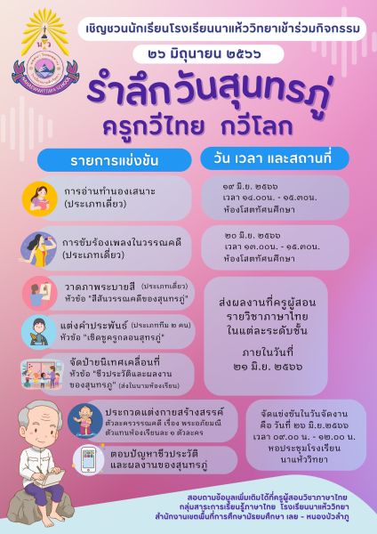 ขอเชิญชวนนักเรียนทุกระดับชั้น เข้าร่วมกิจกรรมเนื่องในวันสุนทรภู่ ในวันที่ 26 มิถุนายน 2566