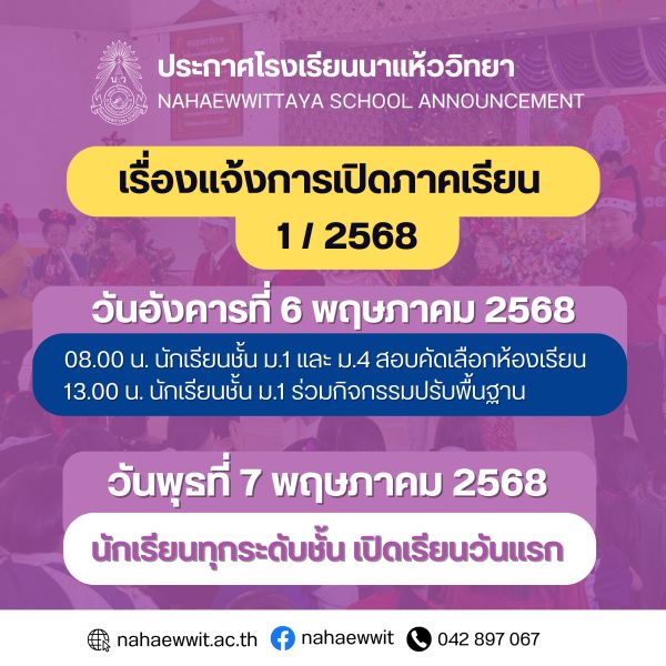 ประกาศโรงเรียนนาแห้ววิทยา เรื่อง รายชื่อผู้มีสิทธิ์เข้าศึกษาต่อ ระดับมัธยมศึกษาปีที่ 1 และมัธยมศึกษาปีที่ 4 ปีการศึกษา 2568
